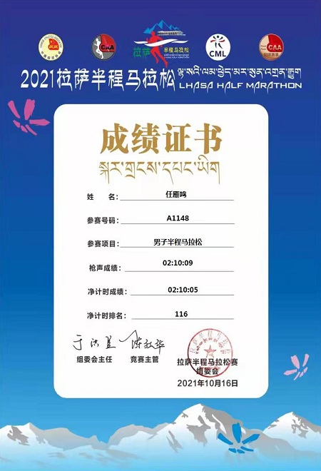 在高原跑步,我最大的问题除了呼吸,最主要的是口干,尽管主办方每隔2.5公里都有补给点,我也都会去补水,但感觉没跑多久,就口干,索性在补给点拿了小瓶矿泉水,即喝即跑,想喝便喝,没了再拿。10公里后,跑进“鹏鑫隧道”(是一个折返),感觉呼吸顺畅多了,腿也变轻便了,好像是找到了高原跑步的感觉,抑或是神山圣地显灵佑我,我开始了一路超越,凡是在我前面不远的,都被我一一反超,15公里握手阿季,17公里拍肩阿蔡,信心满满地跨越拉萨河,跑进市区,跑进我熟悉的金珠东路(前天热身跑过的线路),19公里路过拉萨市政府大门,20公里进入我入住的酒店康昂多南路,此刻,感觉自己彻底活过来了,不久,即转入北京中路,右边就是宏伟的布达拉宫建筑群,不远处,药材山脚的终点拱门在召唤,我终于长舒了一口气,真想大声呼喊:拉萨,我来了,我成功了。我再次挺胸昂头,有力地摆动双臂,仪式感足足地向着终点冲刺(可惜没有留下照片)。此刻,拱门的计时器定格在2:10.05。