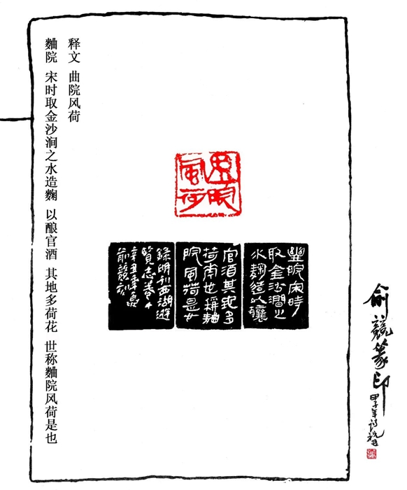 印章边款取自明《西湖游览志》卷十,说明此处宋时为麯院,造官酒的地方。而麯院变成曲院,是康熙的任性。有意思的事,乾隆为了弥补祖父的荒唐,打枪画靶,在麯院旧址,建亭挖池,广植荷花,使之名副其实。但为杭州扮靓一景,亦为美事。