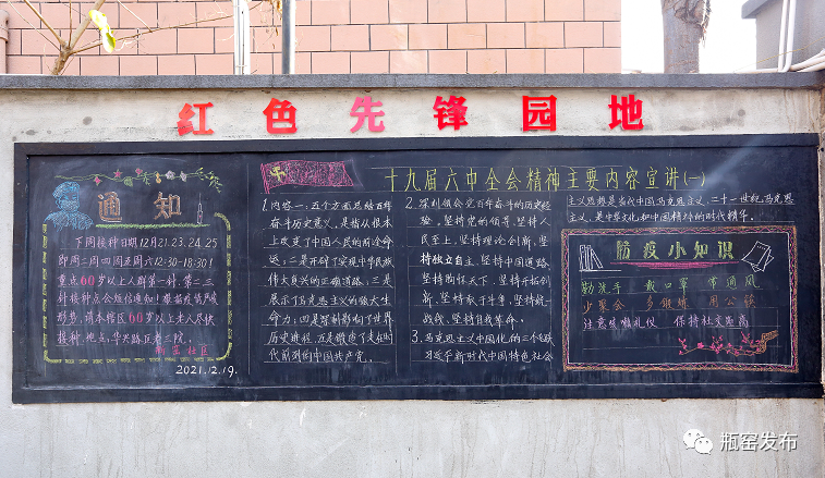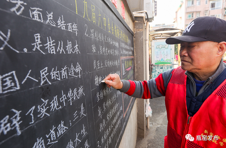 近日,走进余杭区瓶窑镇新窑社区,门口的黑板十分醒目。不仅有彩色粉笔书写的疫情防控最新消息和防疫“顺口溜”提醒群众出行做好个人防护,还有党的十九届六中全会精神主要宣讲内容激励大家万众一心、不畏风雨勇向前。这是由76岁书画爱好者陈雪亮精心制作的防疫黑板报。