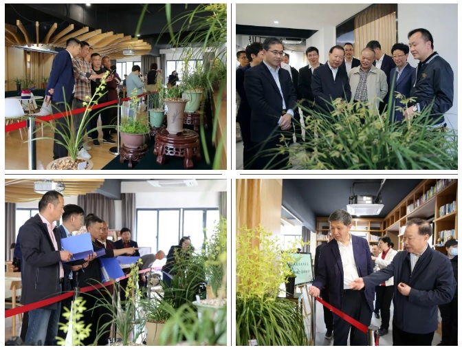 ▲斗兰大赛中,区领导、兰花专家驻足评审兰花