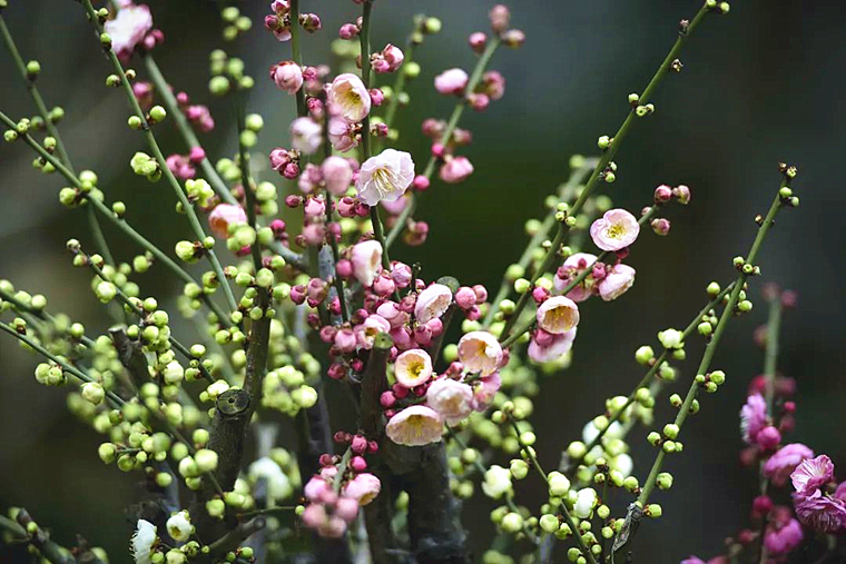 7.整枝修剪:梅花老枝少花或无花,当年新枝着花,休眠期老枝整剪,新枝生长到15厘米左右必需剪除顶稍,称为摘心。控制伸长有利于长出更多芽包。