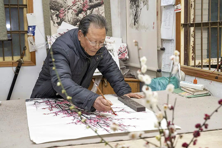 余老爱梅,也热衷于分享这份热爱。他时常将自己画的梅花赠送给亲朋好友,每年都送出百余幅。“我在仁和工作40多年,很少看到农民家中有国画。”为了能让更多村民看到家乡人所画的梅花,他所在的石城书画社还常常举办画展,将他的画作一一呈现给大家。“独乐乐,不如众乐乐。”余老这样笑言。