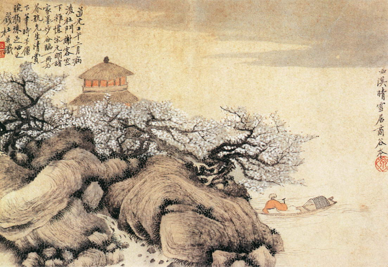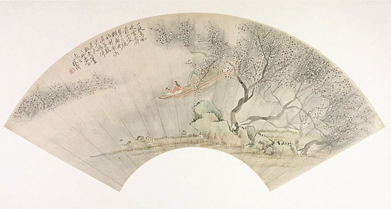 《西溪探梅图》扇页,清,改琦绘,纸本,设色,纵19.2厘米,横54.9厘米