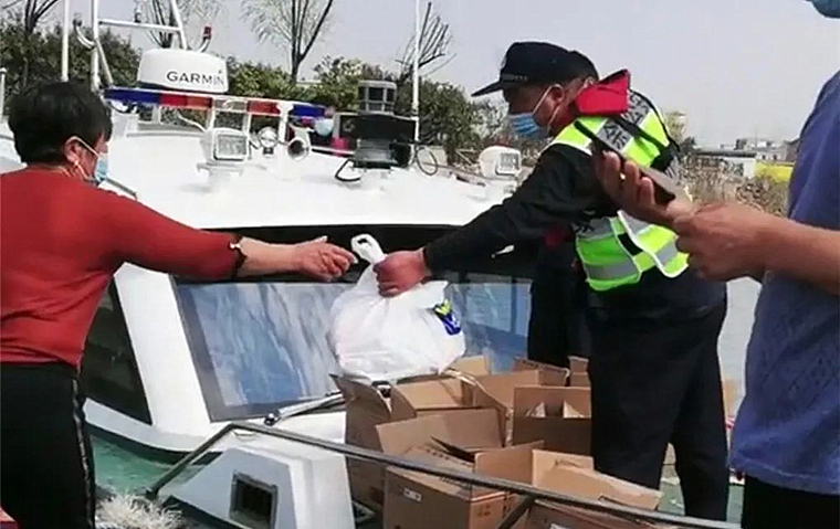 除了水域巡查,胡应龙还带队联合海事部门在仁和五福桥卡点、王家庄卡点,为辖区水域内现有货船上的船民发放生活必需物资。