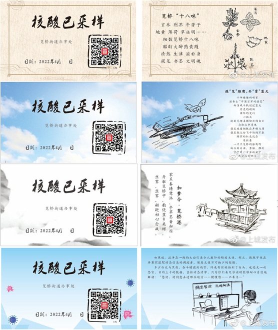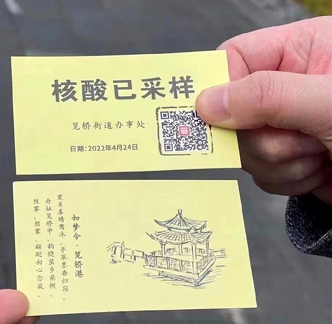 4月24日、25日上午,笕桥街道开展区域核酸检测。居民们做完核酸检测后 会从志愿者手里接过一张核酸检测“纪念卡”。别出心裁的卡面,让有“收集癖”的居民一下来了兴致。“限量版”核酸检测卡一套共四张,卡片上的画面和文字均由街道公共管理办公室原创设计。
