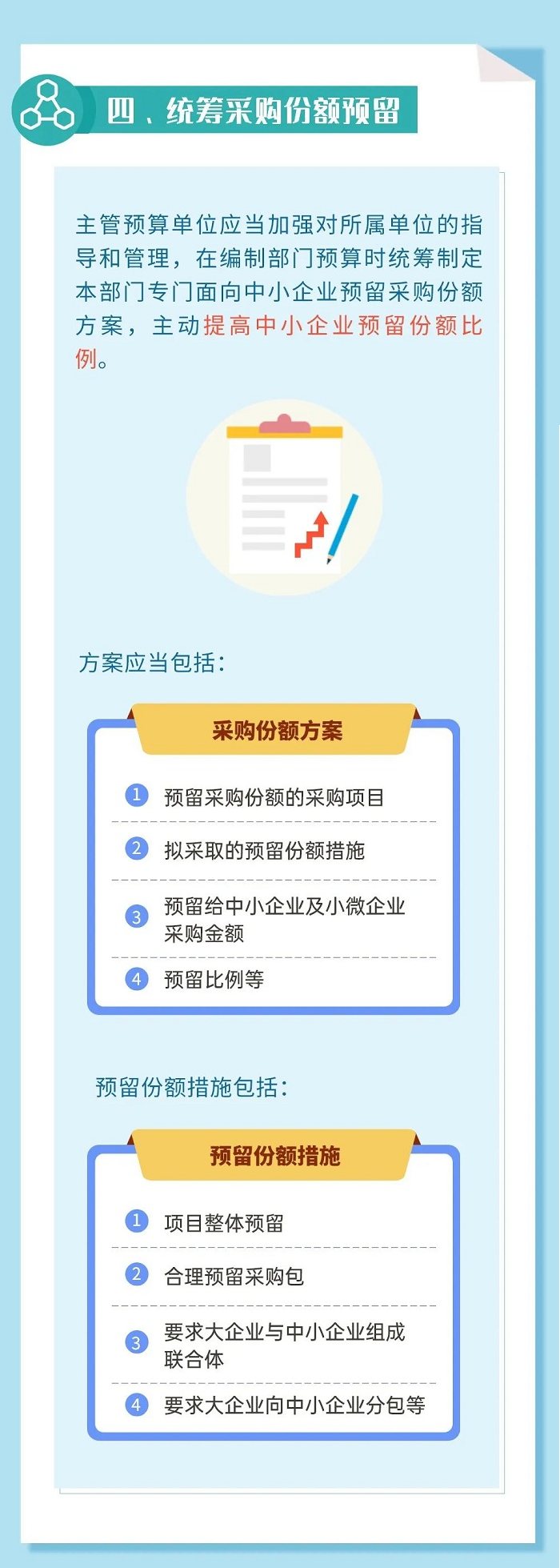 四、统筹采购份额预留。主管预算单位应当加强对所属单位的指导和管理,在编制部门预算时统筹制定本部门专门面向中小企业预留采购份额方案,主动提高中小企业预留份额比例。方案应当包括预留采购份额的采购项目、拟采取的预留份额措施、预留给中小企业以及小微企业的采购金额、预留比例等。预留份额措施包括项目整体预留、合理预留采购包、要求大企业与中小企业组成联合体、要求大企业向中小企业分包等形式。