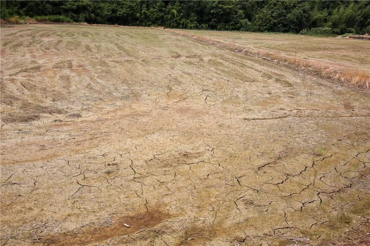 来到於潜镇潜东村,坐落在该村上尤到姚家两个自然村之间的800余亩水稻田虽然依旧泛着绿意,但实际情况却不容乐观。不少水稻田里早已看不见水迹,部分土地已经呈现出开裂状态,最宽的裂缝甚至可以直接插入手掌。
