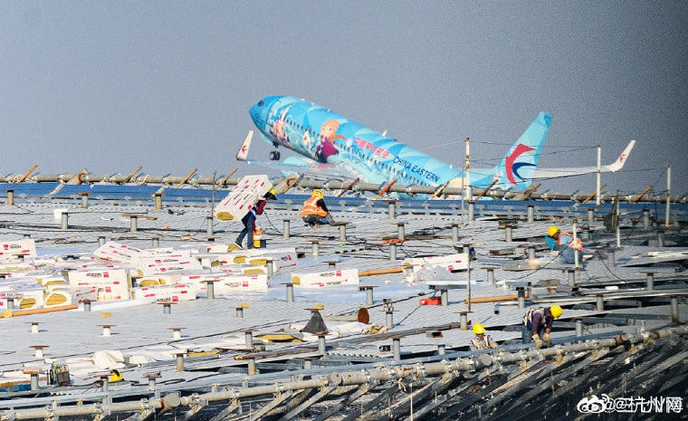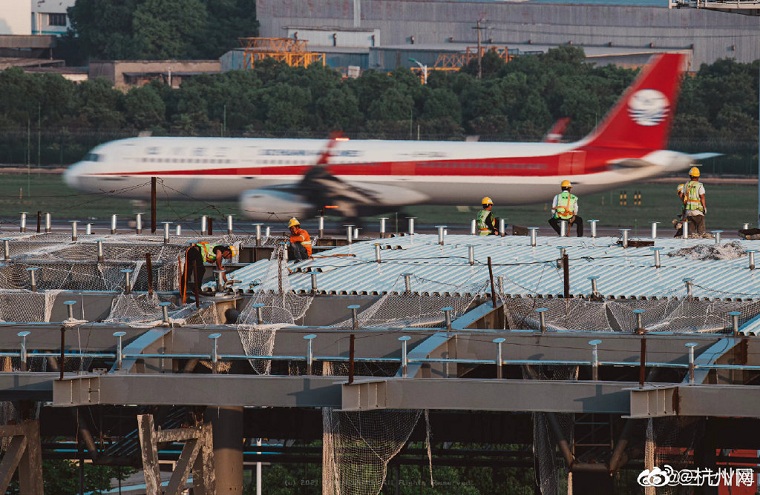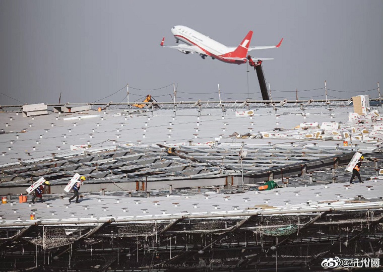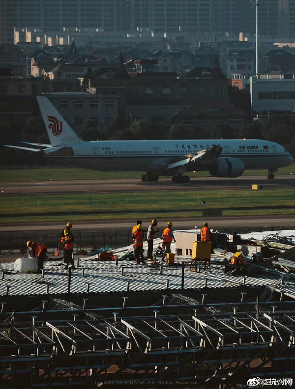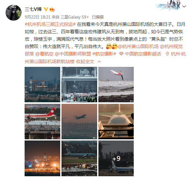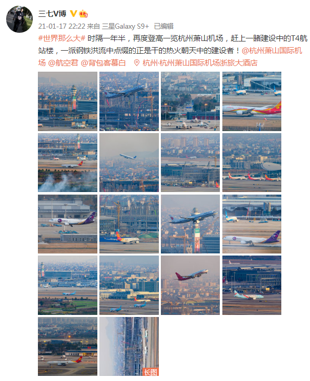 航空摄友@三七V博 发微博感慨:在我看来今天真是杭州萧山国际机场的大喜日子。日月如梭,过去这三、四年看着这座宏伟建筑从无到有,拔地而起,如今已是气势恢宏,琼楼玉宇,满满现代气息!每当放大照片看到像素点上的“黄头盔”(工程建设者)时总不由赞叹:伟大出自平凡,平凡造就伟大。