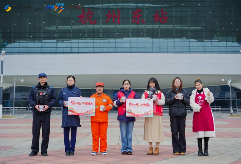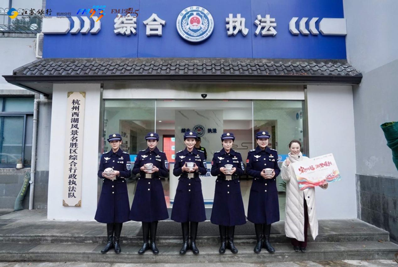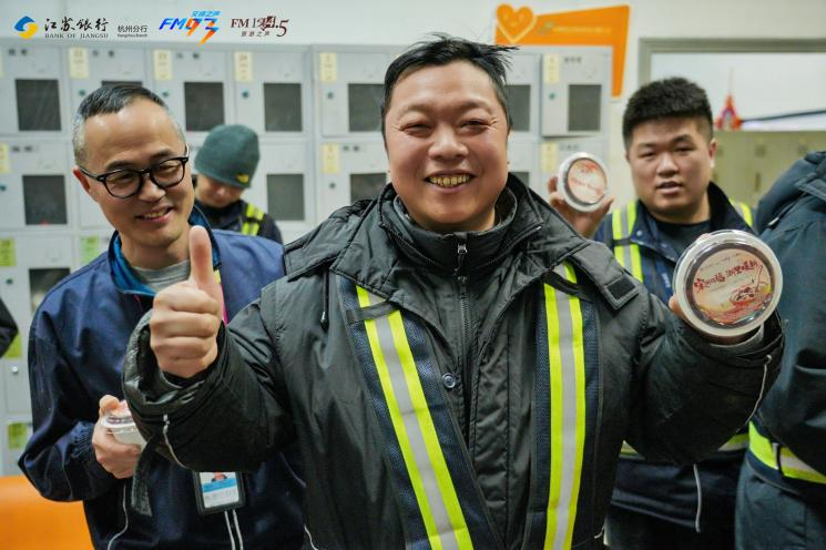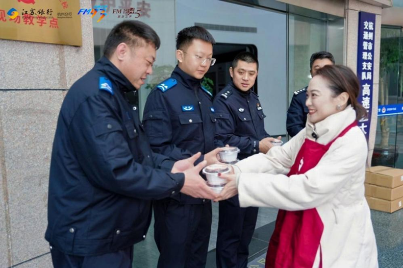 仪式结束后,多路送粥分队即刻出发,开启全城暖冬行动。上午,第一路分队从董家社区启程,先后为杭州东站的铁路交警、杭州东站管委会、拱墅大队大关消防站的工作人员送上热粥;第二路分队则直奔翠苑汇合大厦骑手聚集点,将热气腾腾的腊八粥送到外卖骑手手中,随后又前往钱江世纪城派出所、盈丰街道,在江苏银行杭州分行领导的陪同下,为一线工作者送上暖心关怀。下午,送粥队伍从广电总台出发,足迹遍布萧山机场、小营派出所、拱墅区杭州交警执勤点,更深入西湖区长深高速杭州南收费站旁的高速交警驻地、莲花峰路的杭州城管西湖女子巡逻队办公点、仙宅收费站的交通运输执法队,以及浙江省应急管理厅,累计送出数百碗热粥,让坚守在不同岗位的守护者都能感受到腊八的温暖。