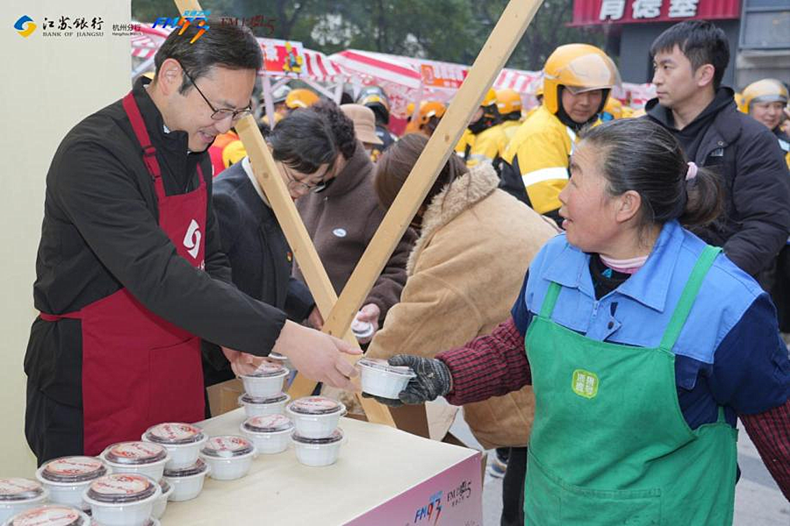 启动仪式上,江苏银行杭州分行党委委员、副行长管友健登台致辞,他表示,十二年的坚守,传递的不仅是一碗粥的温度,更是对城市服务者始终如一的敬意与关爱。随后,管友健副行长与浙江广电集团FM93交通之声副总监王兆峰、小河街道办事处副主任丁慧娜、小河街道董家新村社区党委书记钱宏伟共同登台,为四位特邀代表送上“宋韵福粥”,完成温暖传递仪式。“年关将至,我们每天忙着送年货,今天终于收到了属于自己的温暖祝福!”快递员代表捧着热粥动情说道,“这碗粥里有浙江的味道,更有被惦记的暖意,想送给自己和所有同行一句祝福:平安配送,万事‘粥’全!”