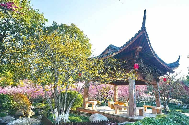 飞檐翘角的宋梅亭成了超山风景的一部分,吴昌硕亲手种植的腊梅,算来已有102岁,正含苞待放。