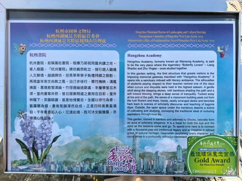 由杭州市园林文物局、杭州西湖风景名胜区管委会联袂打造,杭州西湖风景名胜区凤凰山管理处匠心呈现的园林作品《杭州书院》,经2026年香港花卉展览展品小组评审,喜获最佳环保意念金奖!
