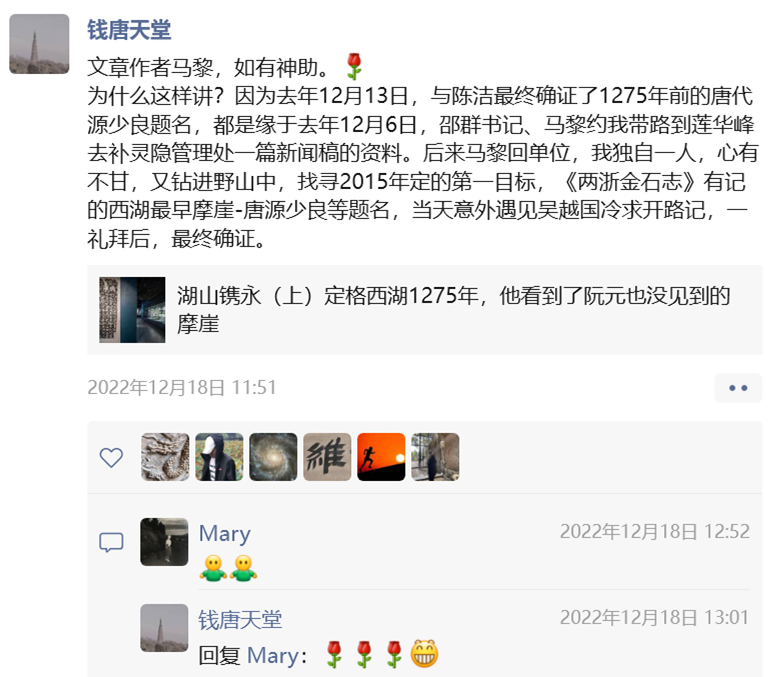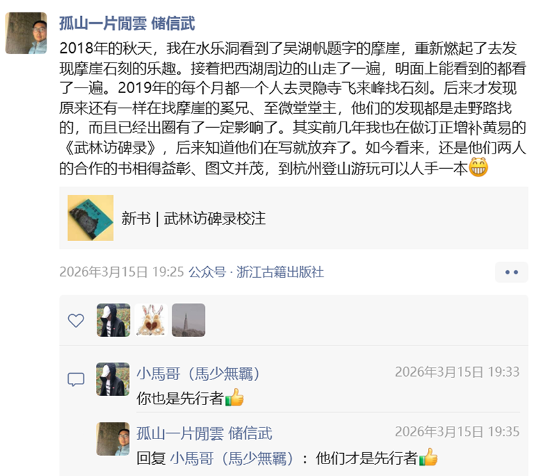 “我和陈洁无论此生多么勤勉,也只有四只眼睛四条腿。如果有更多的人在山中、湖上、城里,带着发现的目光,踏遍青山,那么成千上万只的眼睛,一定会发现更多的题刻。哪怕没有新的发现,也可以留下存世题刻的当代影像。”