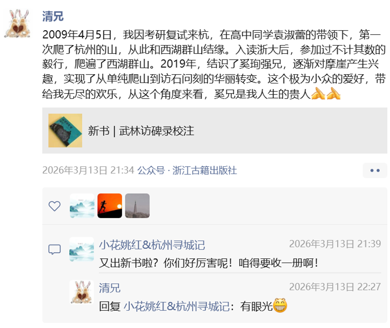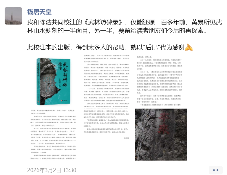 他说,这本书如果放在案头,就没意义了。“大家千万不要被《武林访碑录校注》这样严肃的书名劝退,这是一本当代在杭州访碑的路书。武林访碑之路,人人可行,武林访碑之书,人人可写,我和陈洁都是从门外汉,一路这样过来的,访石带给了我们无穷的生活乐趣。”