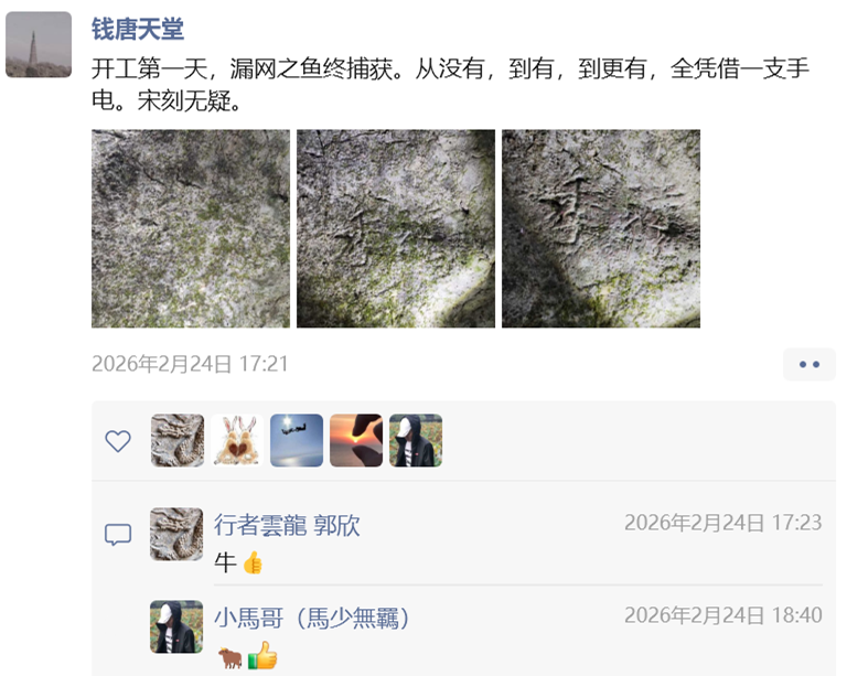 “开工第一天,漏网之鱼终捕获。从没有,到有,到更有,全凭借一支手电。宋刻无疑。”老奚发了一条朋友圈。这又是一条《两浙金石志》《武林访碑录》等著录过,但未标地点,当代遍寻不得的宋代题名。