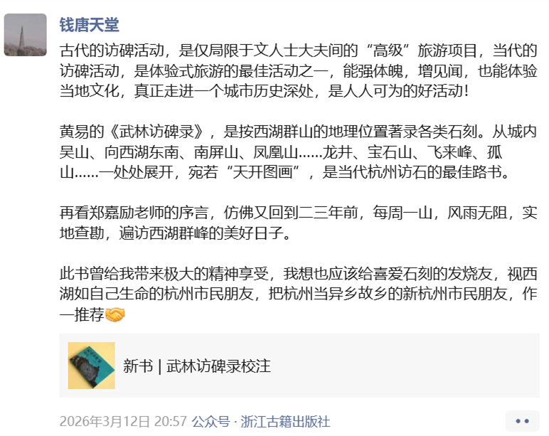 “清代金石学在杭州的鼎盛、西泠印社为什么在杭州,以及现在杭州访石的流行,都和杭州的碑刻和摩崖集中在西湖周边有关,这或许是其他任何城市不具备的条件。”