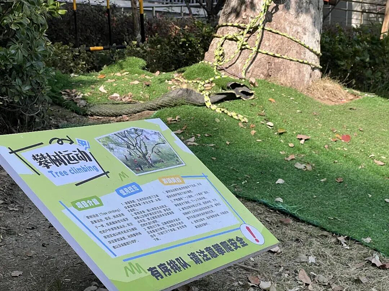 浙江省杭州市钱塘区金沙湖实验学校校园里的攀树运动介绍牌。张纯纯 摄