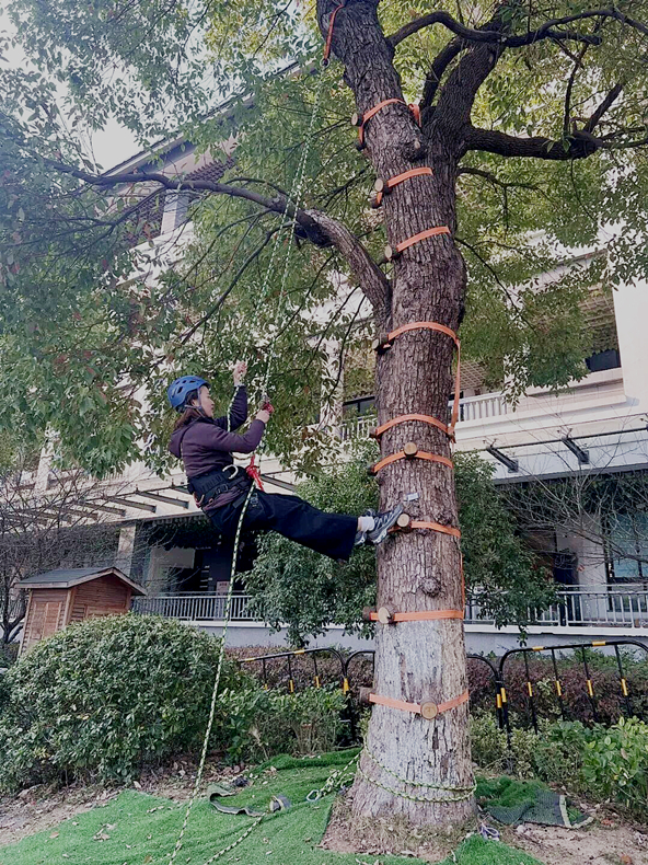 手掌稳稳扣住凸起的岩点,脚尖踩住下方支点,全身有节奏地向上攀爬,不到1分钟的时间,游雪静就已经顺着树干,成功抵达7米左右的目标点位。“好有成就感啊!”在树干顶端,她抬头向天空望去,发现平时习以为常的教学楼在树叶的映衬下有了不一样的美感。
