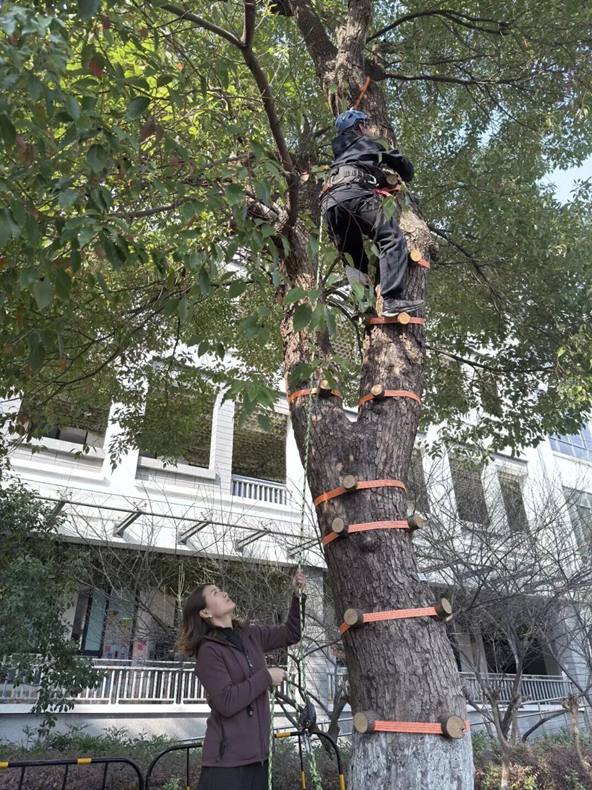 决定开设攀树课后,金沙湖实验学校做的第一件事情便是找树。根据钱塘区制定的攀树课推广方案,攀树运动需要树基稳定、健康生长的大树,且高度在12米及以上。最终,一棵已有9年左右树龄的香樟树被成功选中。
