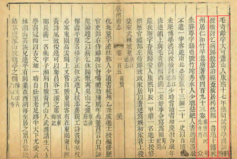 图十 《杭州府志》寓贤一节中有关毛奇龄的记载