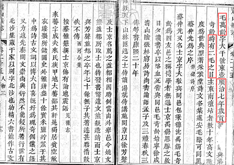 毛奇龄(1623~1716),清代学者,诗人。原名毛甡,字大可,一字于一,又字齐于,别号河右,又号西河,又有僧弥、僧开、初晴、秋晴、晚晴、春庄、春迟诸号,浙江萧山(今属杭州)人,代表作品有《西河合集》、《西河诗话》等[]。在《清史稿》·卷四百八十一(列传二百六十八)・儒林二・毛奇龄传中如是记载“毛奇龄,字大可,又名甡,萧山人。四岁,母口授大学即成诵。总角,陈子龙为推官,奇爱之,遂补诸生。明亡,哭於学宫三日。山贼起,窜身城南山,筑土室,读书其中。顺治三年,明保定伯毛有伦以宁波兵至西陵,奇龄入其军中...康熙十八年,荐举博学鸿儒科,试列二等,授翰林院检讨,充明史纂修官。二十四年,充会试同考官,寻假归,得痺疾,遂不复出...归田后,僦居杭州,著仲氏易,一日著一卦,凡六十四日而书成,讬於其兄锡龄之绪言...奇龄淹贯群书,所自负者在经学,然好为驳辨,他人所已言者,必力反其词。古文尚书自宋吴棫后多疑其伪,及阎若璩作疏证,奇龄力辩为真,遂作古文尚书冤词...三十八年,圣祖南巡,奇龄迎驾於嘉兴,以乐本解说二卷进,温谕奖劳。圣祖三巡至浙,奇龄复谒行在,赐御书一幅。五十二年,卒於家,年九十一...”,从中可知毛奇龄少学奇才,在其少年时期就被推官陈子龙看中并推举为秀才。明朝灭亡后,在顺治三年(1646)加入了活动在萧山西陵一带由毛有伦率领的明军。而后,在康熙十八年(1679),其被举荐入京参加博学鸿儒制科考试,并名列二等,被授予翰林院检讨,以纂修官之名参与《明史》的修撰。在康熙二十四年(1685),其被任命为会试分房阅卷官,但不久就请假归籍,而后就得了关节筋骨痛、行动不便的慢性病,再后面就是其在杭州租房居住,编纂《仲氏易》。最后,就是在康熙五十二年(1713),其病逝在家中,卒年九十一岁。《清史稿》的这段文字,对于毛奇龄人生经历描述的极为笼统,比如他为什么不久便请假归籍,为什么会得痺疾,以及是什么时候来的杭州,并且为什么会居住在杭州?如此多的疑问促使我去翻阅更多的史料信息。