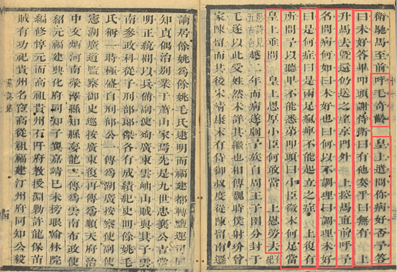 “越三年,上南巡至浙,以躬祷禹陵渡江,予扶疾迎驾于西陵渡口。上临升御马,遥见予,遣侍卫驰马至前,呼:毛奇龄,皇上遣问你病好否?予答曰:未好。答毕叩头谢。侍卫曰:有他奏乎?曰:无有。上升马去。暨还,仍送之望京门外。上控马直前,呼予名,问病何如?曰:未好也。曰:何以不调理?曰:调理未好。曰:是何症?曰:是两足疯痹不能起立之症。上复有所问,予以听卑不能悉,第叩头曰:小臣微末,何足当皇上垂问?皇上恩厚,小臣何敢当。上慰劳去。越二年而病遂剧。”