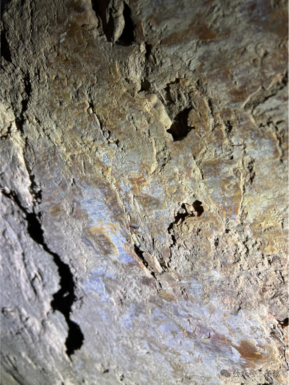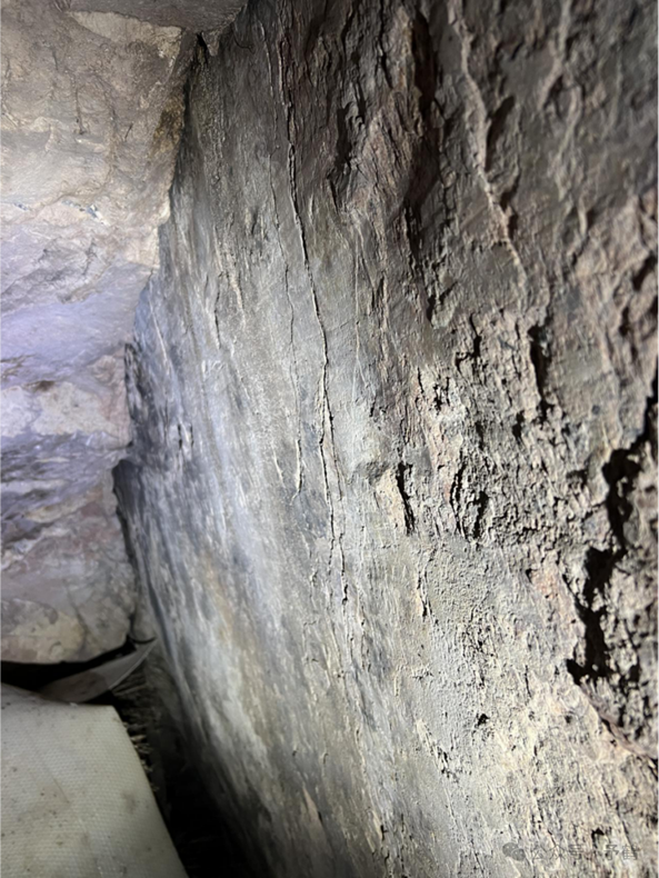 还有,在考察黄龙洞内部构造过程中,发现了一处可以说是地质奇观的石壁(图五十二、五十三),该石壁位于黄龙洞洞口内部右侧,石面极其平整光滑,大约有十几个平方。原本以为,此处是古人开凿石块时使用绳锯切割形成的,但经过深入勘察,发现该处石壁刚好位于两块巨型岩体的接合处,其顶部夹缝平均宽度约两公分,这条缝隙笔直延伸到两块岩体的深处,这绝非人力所能为,而很有可能是千百万年地质构造运动,两块岩体相互挤压摩擦造成的这种光滑如璧的奇观,感兴趣的读者可以前往一探究竟。