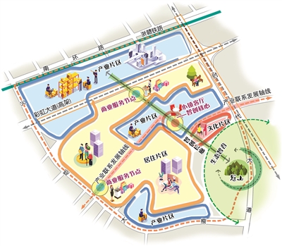 小镇规划面积为3.75平方公里,空间布局围绕“一心两轴四区”的格局展开,以核心区为“原点”,以智创长廊和产业联系发展轴,串联小镇空间布局以及延展小镇产业生态链,并形成集产业、居住、文化、生态于一体的小镇形态。
