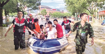 萧山民防应急救援队在转移受灾群众。 通讯员 孙伟 记者 唐柯 摄