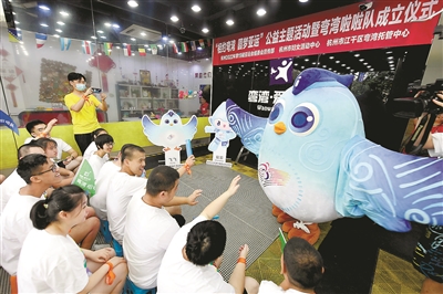 杭州日报讯 6月22日,良渚文化中的“神鸟”——杭州2022年第4届亚残运会吉祥物“飞飞”来到位于凯旋路上的江干区弯湾托管中心,与这里的特殊孩子们一起快乐互动,“圆梦亚运”弯湾啦啦队也正式授旗成立。