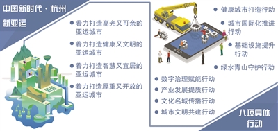 关键词:健康 文明 亚运城市行动将健康杭州、文明城市建设有机结合,推动全民健身运动更加火热、市民文明素质不断提升。 为此,“城市文明共建行动”将全面开展亚运进学校、进社区(村)、进社团、进机关(企业)“亚运四进”活动,广泛动员社会力量参与城市运行保障、赛场文明宣传、和谐环境创建和爱心助残等志愿服务工作。 亚运筹办的强大带动效应,能够点燃全社会的发展热情,扩大有效投资,激发消费潜力。其中,“产业发展提质行动”就提出,充分发挥智能亚运和市场开发政策带动效应,促进亚运相关智能产业发展和传统产业转型升级。加快发展运动健身、休闲养生、线上诊疗、生物医药等产业,积极培育可穿戴运动设备和智能运动装备等智能相关产业,推动赛事经济集聚发展和“赛会+文旅”产业融合发展,形成与亚运城市相匹配的大健康产业体系。推进“亚运创客计划”,开展集学习、融资、推广、社交、竞技等为一体的“创客运动会”,营造浓厚的创新创业氛围。 关键词:智慧 宜居 绿色生态是杭州的城市本底,数字经济和数字治理是杭州的独特优势。 杭州亚运城市行动,全面融入全国数字治理第一城和美丽中国杭州样本建设。根据“绿水青山守护行动”,我市将持续推进大气污染防治工作,大力推进城乡环境整治行动,加强城市湿地建设,全面提升城市“洁化、序化、绿化、亮化、美化”水平。积极倡导绿色生产生活方式,亚运村、大型比赛场馆区域通勤采用新能源车辆。鼓励企事业单位种植“亚运公益林”,鼓励市民参与“亚运森林”网络种树,使绿色成为亚运会最靓丽的色彩。 在“数字治理赋能行动”中,围绕智能办赛、智能参赛、智能观赛,将加快开发场馆建设、赛时指挥、交通组织、人员调度等应用场景,研究建立适应赛时工作需要、符合赛事组织特点的智能化赛时指挥体系,使“智能亚运”成为亚运会的最大亮点,通过举办一届史上“最智能、最绿色”的亚运会,向世界展示城市治理现代化和生态文明建设的生动实践。 关键词:厚重 开放 亚运会不仅是体育运动的赛事,更是亚洲文化的盛会、国际交流的平台。 举办亚运会,将进一步彰显杭州历史文化名城魅力,扩大“中华文明圣地”影响力。“文化名城传播行动”中也提到,要高标准推进西湖景区全域整治提升和大运河文化国家公园、良渚文化国家公园建设,在“迎亚运”系列活动中充分植入世界文化遗产的元素。设立“城市客厅”,展示杭州文化物产。开展“杭州欢迎你”系列活动。 在补齐城市国际化短板方面,我市将继续扩大国际经贸合作和人文交流,推进重要场所国际化标识全覆盖,吸引有影响力的国际组织在杭设立分支机构,吸引海外优质教育、医疗机构来杭合作办学办医,吸引更多海外高端人才来杭创新创业。其中,推动长三角城市公交、地铁、公园、医保等公共服务“一卡通”,推进建设教育国际化示范校,开展若干个国际化社区建设试点……都是“城市国际化推进行动”的具体内容。 |